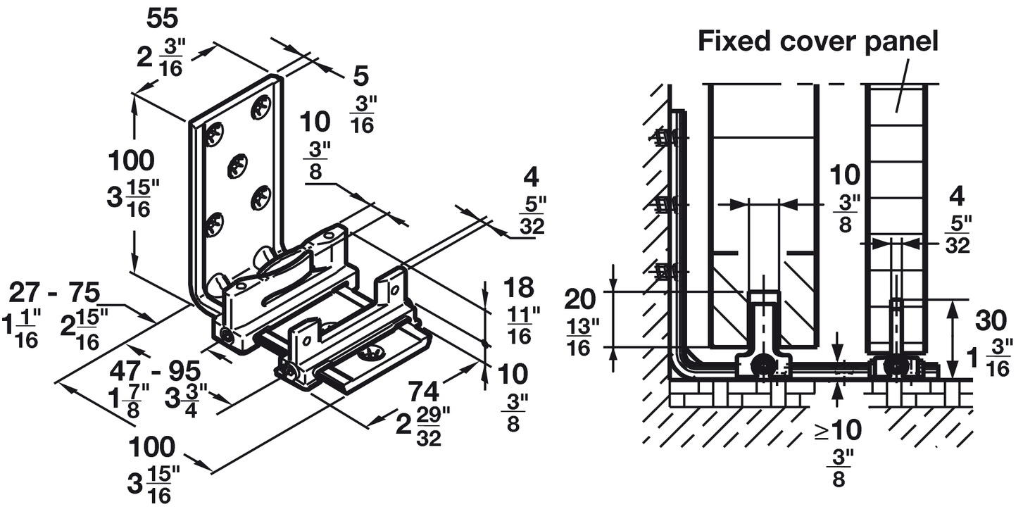 Hafele 940.40.072 Floor Guide, Double Element, Wall-mounted, HAWA Confort 120, 264 lbs. Load bearing capacity, Aluminum, Plastic, Black