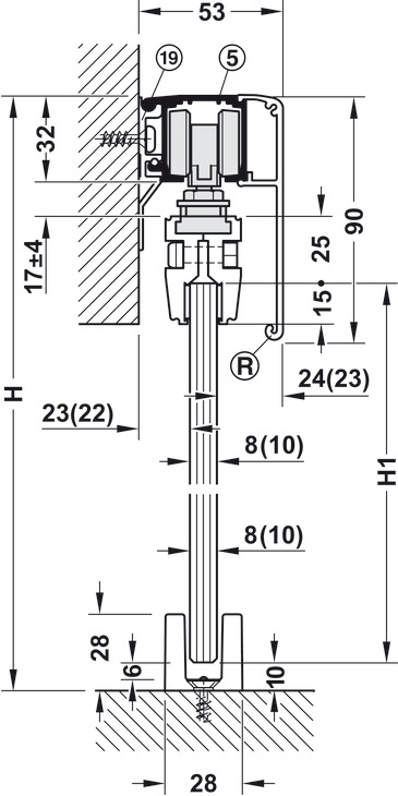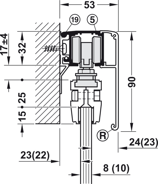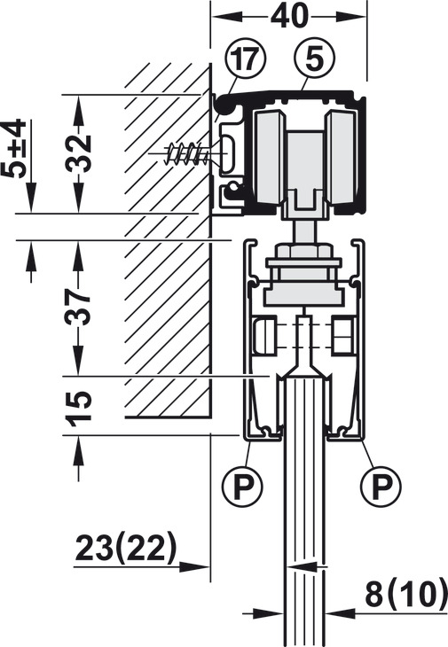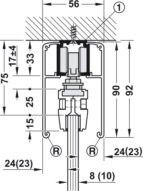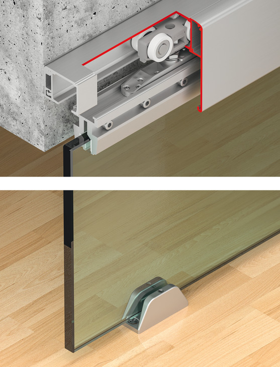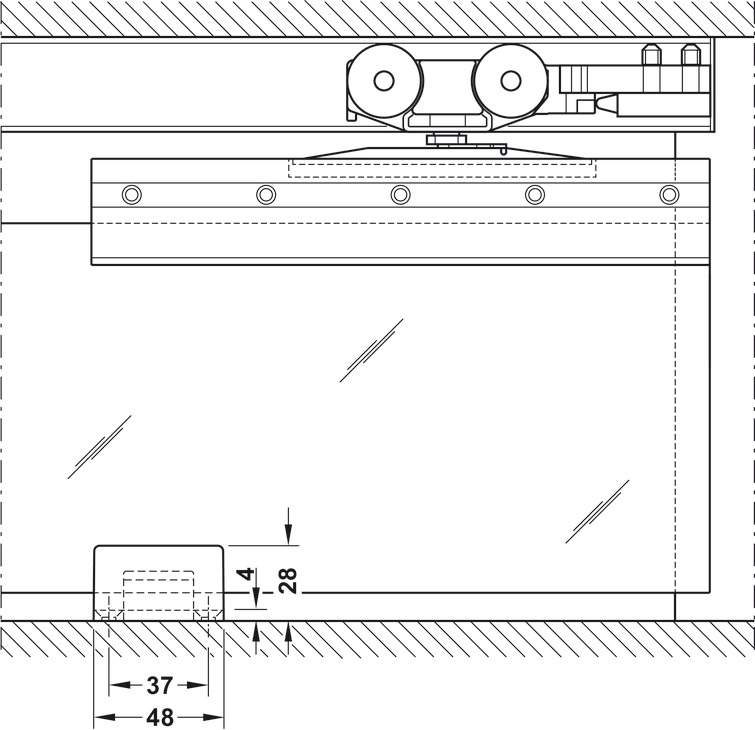 Hafele 940.83.035 Sliding Door Fitting, Slido D-Line11 80L, Set Without Running Track, For 1-Leaf Glass Sliding Doors, For Door Weight 80 kg (176 lbs.), With Soft and Self Closing Mechanism on One Side, Set