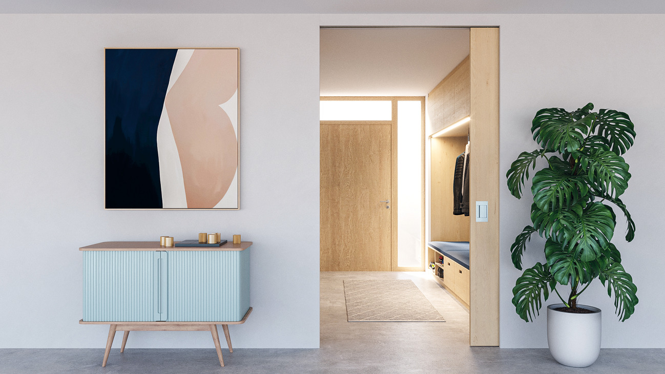 Pocket door solution for integrated or screwed on ceiling installation