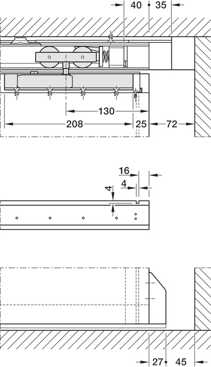 The use of a soft and self closing mechanism is possible at the opening side with partially opening doors.