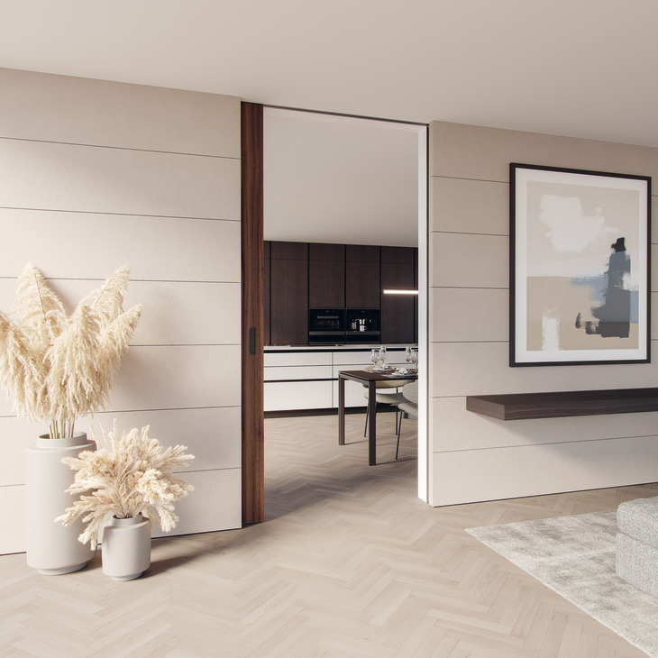 Note on door width: The max. door width for the wall pocket solution is 800 mm (31-1/2").