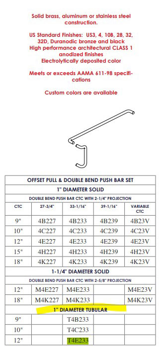 12" X 33" Offset Pull & Double Bend Push Bar Set