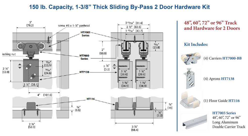 Hettich HT72-138-5 150 lb. Capacity, 1-3/8” Thick By-Pass 2 Door Hardware Kit - 5' Track
