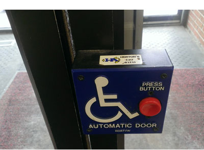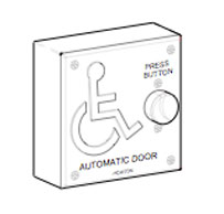 For use on handicap designated openings. Momentary contact microswitch assembly with 1" (25) diameter red button with junction box. Junction box is 4" (102mm) square x 1 1/2" (38) deep, molded plastic with 1/8" (3) thick blue plastic cover with raised white lettering and handicap logo. This unit may be surface mounted on the wall or a post.