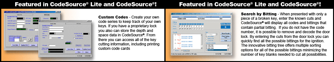 . CodeSource® allows you to search for a code in a variety of ways: Blitz™, Switch Blitz™ or The Punch Machine™ code card number, manufacturer name, key blank number, DSD (Depth & Spacing Data) number, application or vehicle model. With any or all of this information, the system will find the code that you need. For maximum computing power choose CodeSource® for your PC; it is