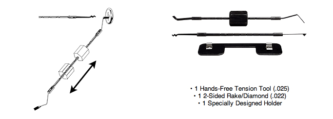 HPC's Hands-Free Tension Tool Kit takes the difficulty out of picking! No need to fumble with the tension. Simply slip the Hands-Free Tension Tool into your cylinder keyway (vertical or horizontal), slide and set the weight to adjust the amount of tension, and then let go! All that's left is raking the pins! The Hands-Free Tension Tool Kit comes complete with a Hands-Free Tension Tool and a matching 2-sided Rake/Diamond. The Tension and Picking Tools clip together with a specially designed holder. Difficult locks will become easier to pick, and simple locks will pick quicker with ease.