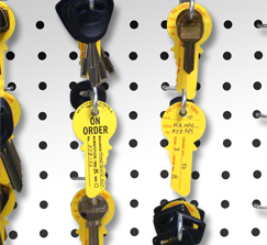 These tags offer a quick visual method of controlling key blank inventory. Simply mount these bright yellow tags directly on the hook in front of your determined "order point." They are printed in black and red on heavy card stock with a metal grommet.100 per package.