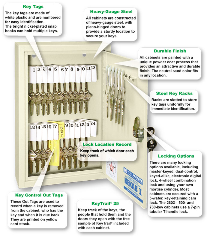 The plastic, numbered key tags hang uniformly for quick idetificationAll KeKab® key cabinets are constructed of heavy-gauge welded steel with full piano hinges for a sturdy location for your keysWhen a key is issued, use the Out Tags to record to whom it was issued and when it is due back