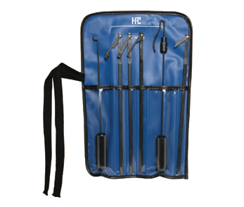 The HPC Safe Opening Tool Kit is a collection of six tools designed for use on safe locks after burglary has been attempted. Entering through the existing spindle hole, the ends of the tools flip open and allow you to work from the inside of the lock. These tools are specifically designed to recreate correct combination input by allowing you to deactivate relocking mechanisms and draw back bolts. The ends of the tools are like little fingers and are designed to manipulate the inner workings of many safe locks. With the HPC Safe Opening Kit you can quickly and easily open LaGard 1800 and 2100, Mosler 302 and 402, and many S&G safe locks. This kit comes complete with 6 tools and instructions in a handy roll-up case for convenient storage.