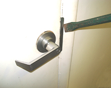 All doors using spring latch type locks should have the added protection of a latch/bolt guard. The flanges of these guards will keep any prying tools away from the latch.