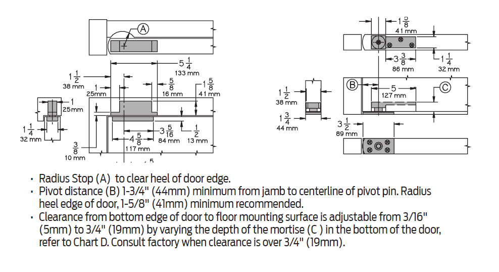 Adjustable floor to door clearance 3/16" to 3/4", consult factory if greater than 3/4".
