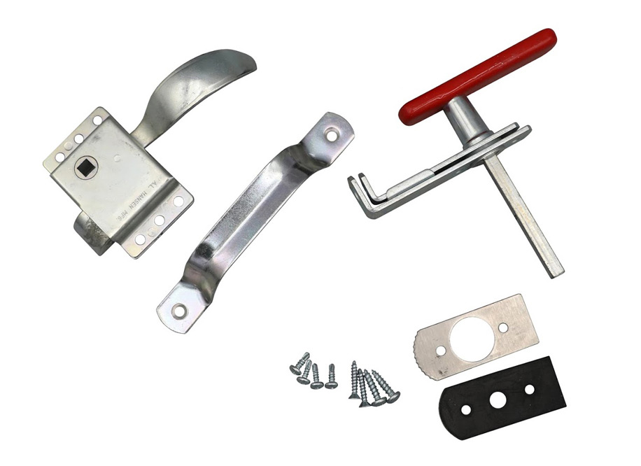 Hardware: Hardware includes a heavy duty hinge, slam latch, heavy gauge automatic hold open arm with red grip, compression spring-operated cylinder, exterior handle with integral padlock hasp, and interior locking handle with interior padlock hasp.