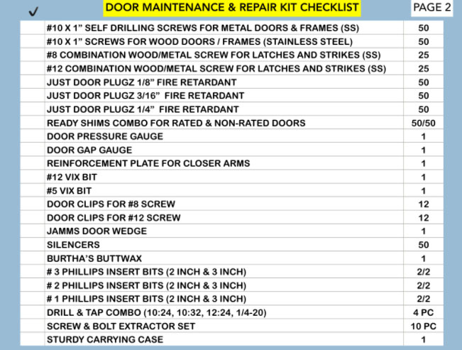 Screw Bolt Extractor set, 100 Ready Shims For Both Rated and NonRated Doors, A Door Wedge you place under the door edge to hold it open while you fix it up, Door Pressure Gauge and Door Gap Gauge, Drills & Taps, #1,#2 and #3 Phillips Insert tips, Door Silencers and Burtha's ButtWax