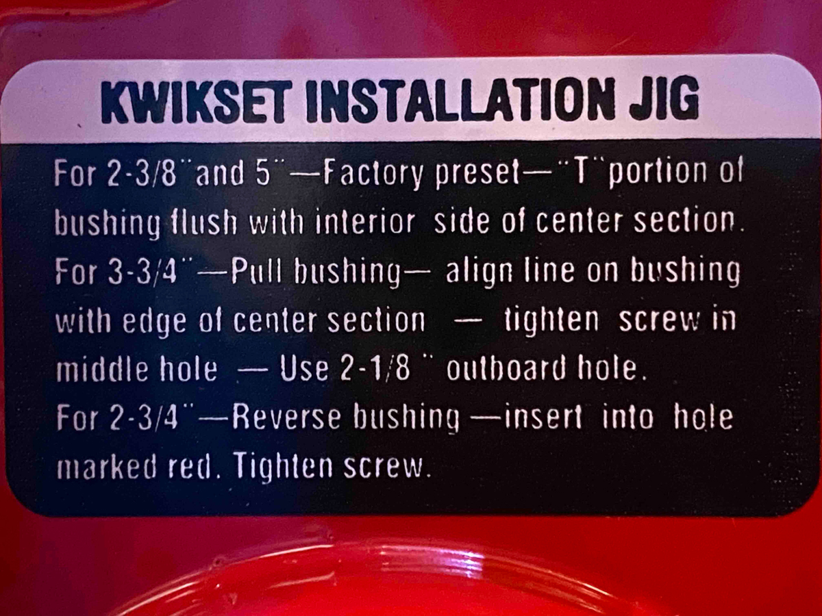 This is the Kwikset version of the Lock Installation Kit that Kwikset manufactured circa 1990’s and is superior to its discontinued replacement in that it can handle 2-3/8", 2-3/4", 3-3/4", 5" backsets with its only limitation in that it does not a 1-1/2" diameter hole out of the box. If this was an issue I would simply manufacturer a conversion adapter ring for this purpose where it had a nominal OD of 2-1/8" and a nominal ID of 1-1/2". This item was changed from this original design into the replacement which can be seen here