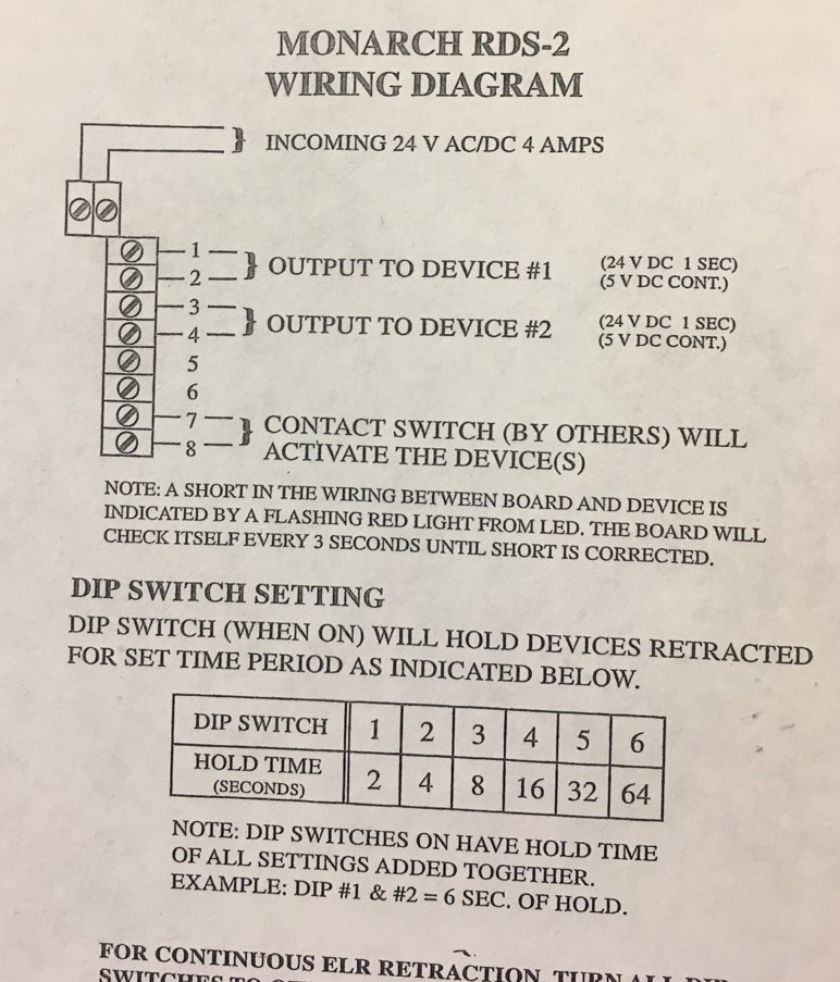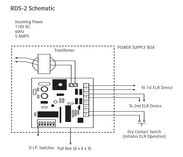 The RDS-2, when energized by closing a dry contact switch, will activate the first ELR device and one second later will activate the second ELR device