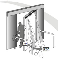 Provides pedestrian safety protection within the path of moving swing, fold and revolving doors.
