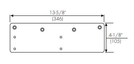 For use where the ceiling clearance is between 1-7/8" and 3-7/8" (48 and 98mm) or where a surface or concealed overhead door holder prevents normal top jamb mounting. This plate drops the closer and allows the arm mounting screws to clear the bottom of the door holder. This places the centerline of the arm mounting screws at 3 1/8" (79mm) from the top of the door.