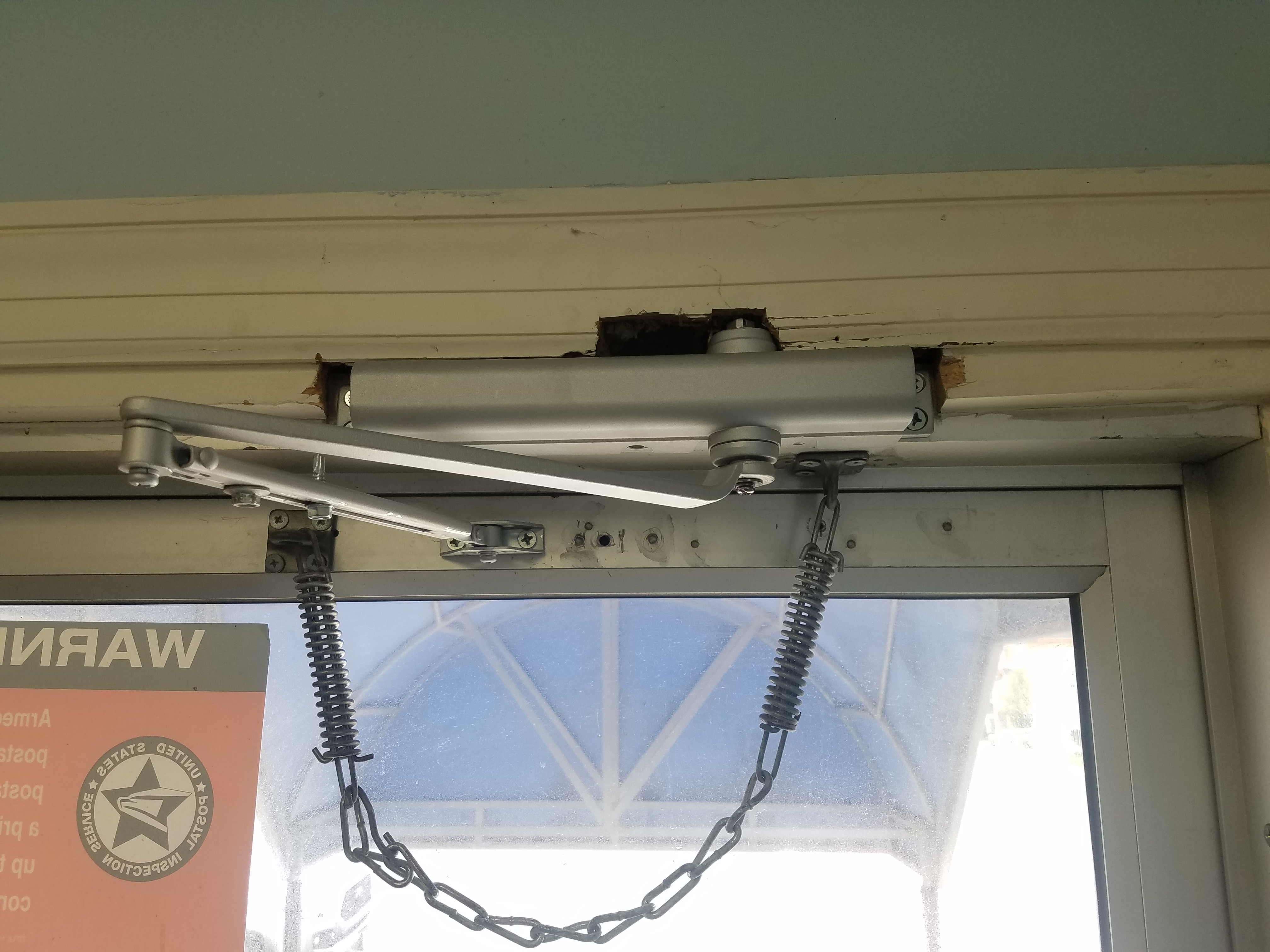 Q: 9ft 200 lb solid wood door. no brand on the closer. thing is swinging like it weighs 2 pounds. no idea who installed it. peters restaurant. trying to help, what advice. is it the closer itself needs replacing, or was it installed wrong. Photo is here :
