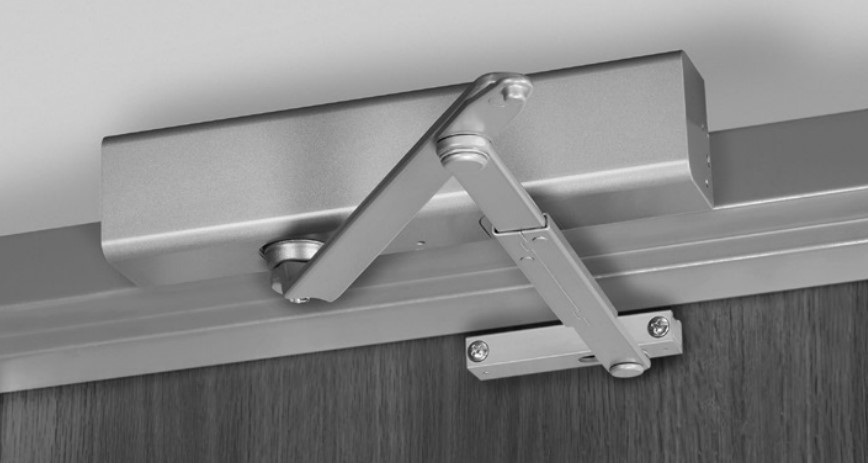 Can be used for either parallel arm or top jamb applications. Unitrol arms combine the features of a double lever arm overhead door stop/holder with the backcheck feature of the door closer to reduce door stopping shock loads to a minimum. The Unitrol uses a compression spring buffer at the soffit plate/arm shoe that will absorb 30 lbs. of force, 5° prior to the door’s dead stop. Coupled with the door closer’s backcheck feature, this arm provides the most controlled stop available with a surface door closer.