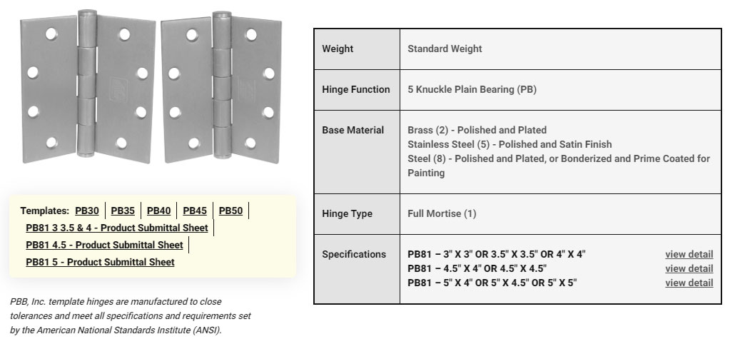 PBB PB81633 PB81 4-1/2 x 4-1/2 Plain Bearing Hinge Full Mortise 5 Knuckle Standard Weight - 633 US4 Dull Brass