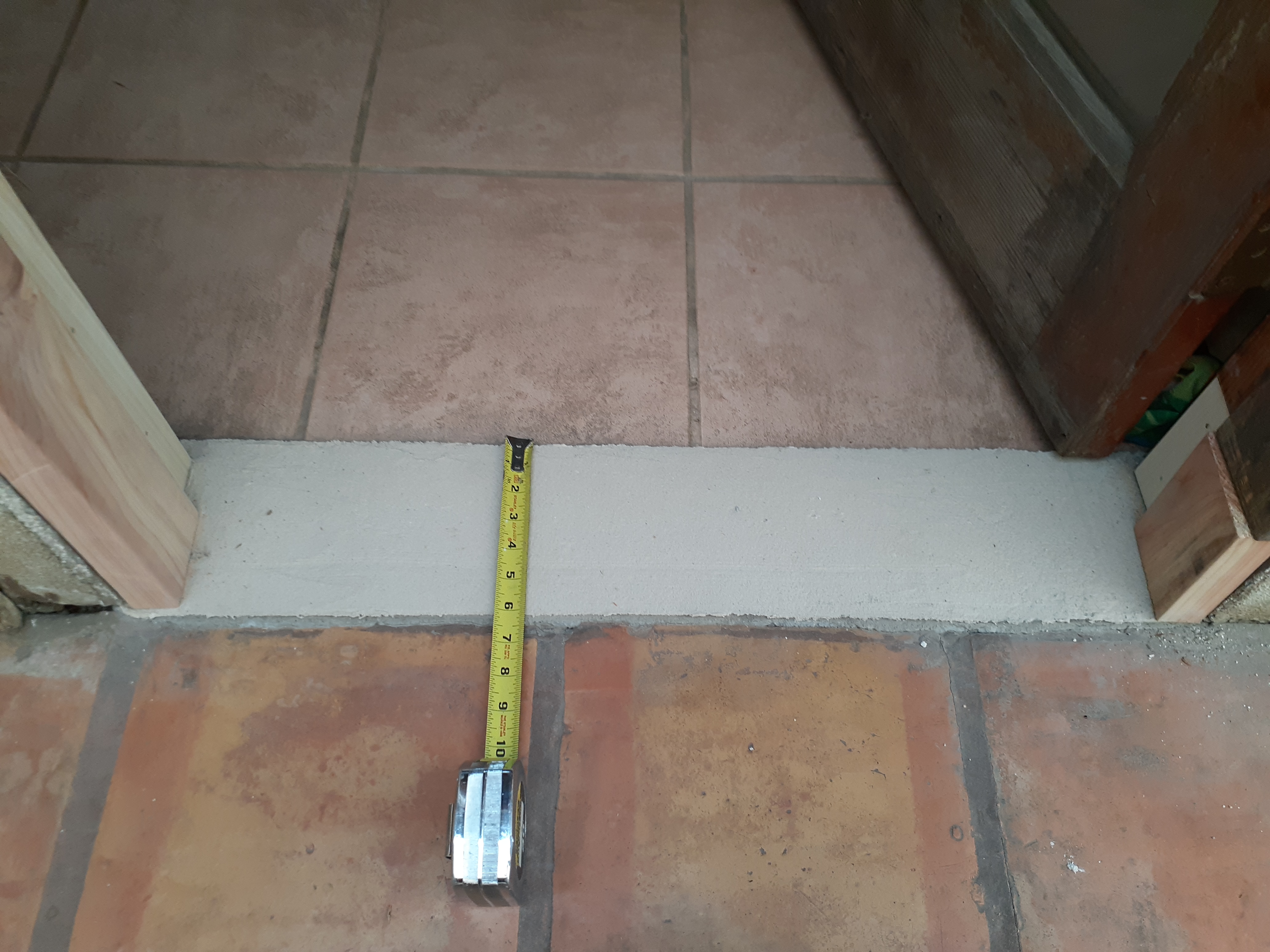I removed the wooden threshold and fill it with cement. It's about 1/4" thick. My idea is to put a thin piece of wood over this cement and then cover it with a nose sill. 1.5" high would keep water from coming in. What would you suggest?