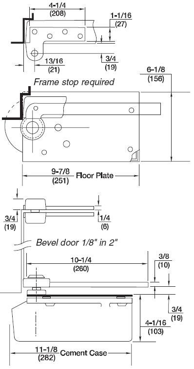 Selective Hold-Open (SHO) Factory-installed on 27 & 28 Series closers. Hold-open may be turned on/off. Automatic Hold-Open (AHO) Available on certain series closers with or without dead stop. Preset at factory for specific degree of hold-open. Degree of hold-open cannot be changed, nor can closer be made into non hold-open. Delayed Action (DA) Provided on barrier-free installations. Permits door to remain ajar (at 70°) for up to 30 seconds. Operates by separate valve and can be shut off if not needed. Not available on closers furnished with cold weather fluid, and not recommended for exterior applications because of weather factors. (27 & 28 series only) Physically Handicapped (PH) To comply with guidelines established in the American With Disabilities Act, lighter opening forces are met if closers are ordered with a PH prefix. If 5 pounds of opening on interior doors is needed, simply order PH. If 8.5# of force is needed, specify Prefix PH and suffix 8.5#. Be advised that lower opening forces mean lower closer forces. PH products should not be ordered for exterior doors or fire rated openings. Fire/Lifesafety openings take precedence over the convenience of ADA. Securing a building is also a major concern and a lighter closer may not be strong enough to secure a latch bolt in a strike. Use care when specifying PH products. Cold Weather Fluid (CWF) Should be considered in installations where ground temperature is constantly below +15°F.May be used in temperatures as low as -35°F. Sealed Closer (SC) Used where water contact may occur. Provides gasketing and a cover plate that are epoxied around the case with the closer inside.Not available for replacement closers unless cement case is also replaced. Fire Rated (F) Used on labeled fire door requiring steel base pivot. PH with 3 pounds of opening force may not be used on fire doors.