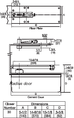 30 Series floor closers are double acting and non-handed. Maximum degree of opening 103°
