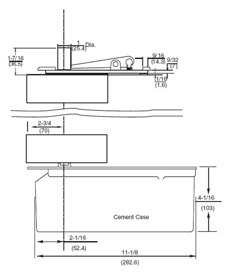 •Patch fittings included at top and bottom for tempered glass doors 3/8"-1/2" thick • Built-in positive dead stop prevents door from swinging beyond the desired opening degree (specify 85, 90, 95 or 105°) • Separate and independent valves for closing speed, latch speed and backcheck • Delayed action available-prefix “DA” • Available non hold-open (NHO), automatic hold open (AHO) or selective hold open (SHO) at same degree as dead stop • Models available to meet ANSI A117.1 opening force requirements. Prefix “PH” • Cold weather fluid available-specify “CWF” (not available for closers with “DA”) • Sealed closer available-specify “SC” • Available with floor plate or threshold installation (floor plate shown) • Cycolac cement case • Not allowed for fire rated doors • Applied stop required