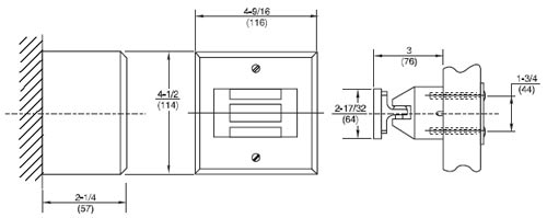 •Typical Usage: Surface Wiring • Total Projection: 5-1/4"(133mm) • Mounting Requirements: Switch Box Included 4-1/2" x 4-9/16" x 2-5/16" (114 x 116 x 59mm) deep • Voltage and Current: 24 VAC/DC .25 amp • Substantial wall reinforcement required