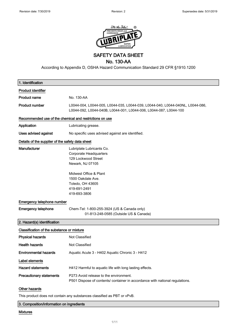 • Lubriplate 130-AA Multi-Purpose Calcium Grease