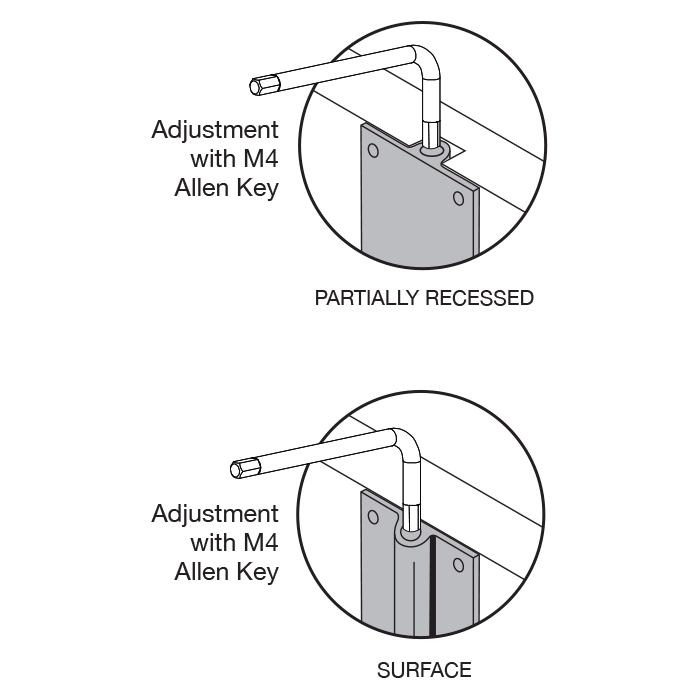 ±10mm adjustment can be made from the top of the door with a M4 Allen Key (included)