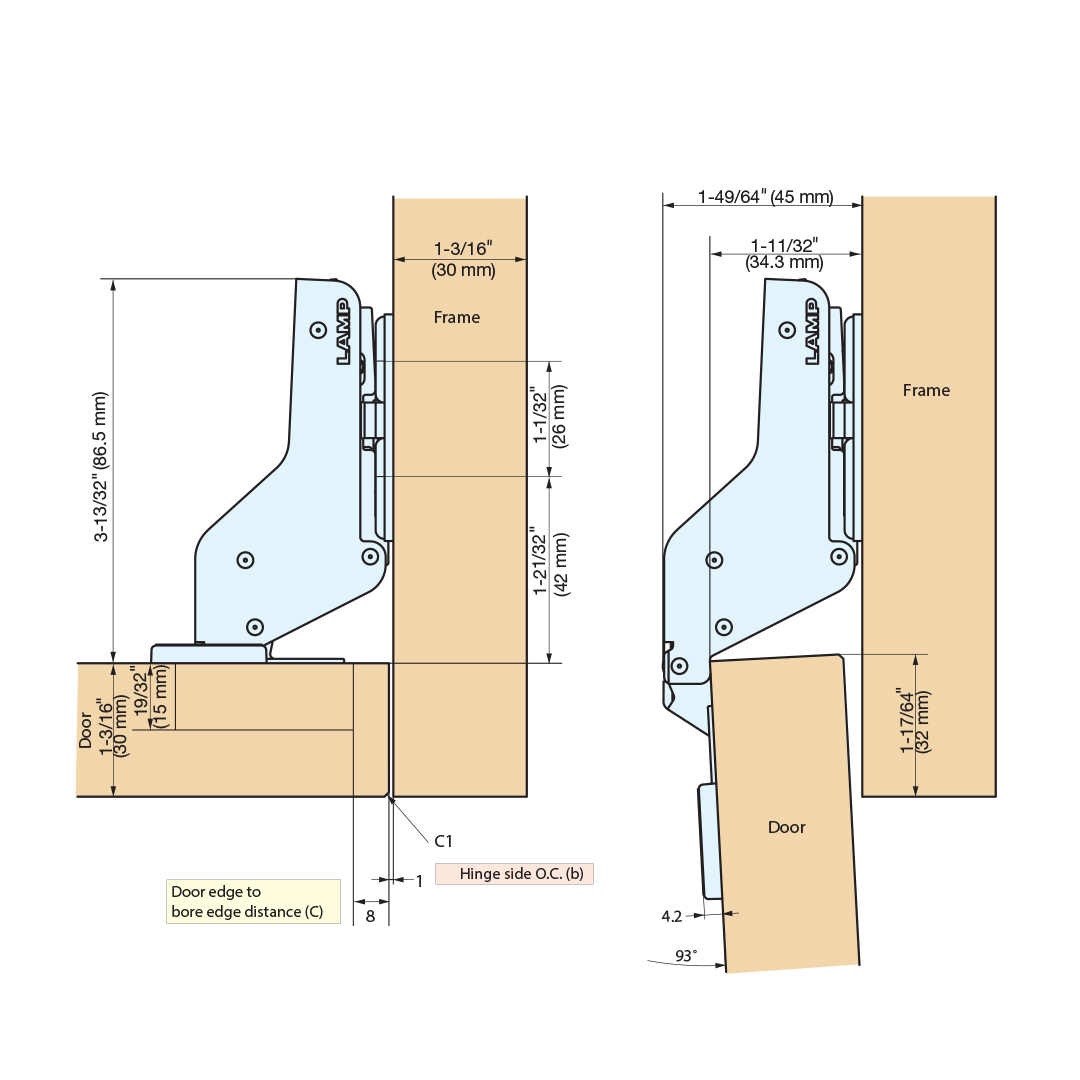Heavy duty concealed hinge eliminates the need to use 5 or more standard euro hinges in cabinets or furniture. This reduces installation cost and time, and provides a better overall aesthetic