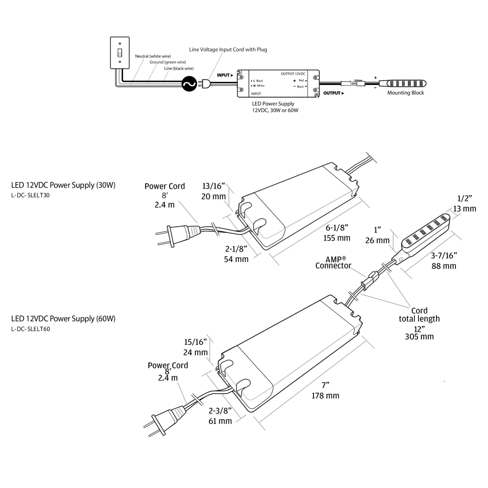 • Mounting block and power cord are included with each power supply