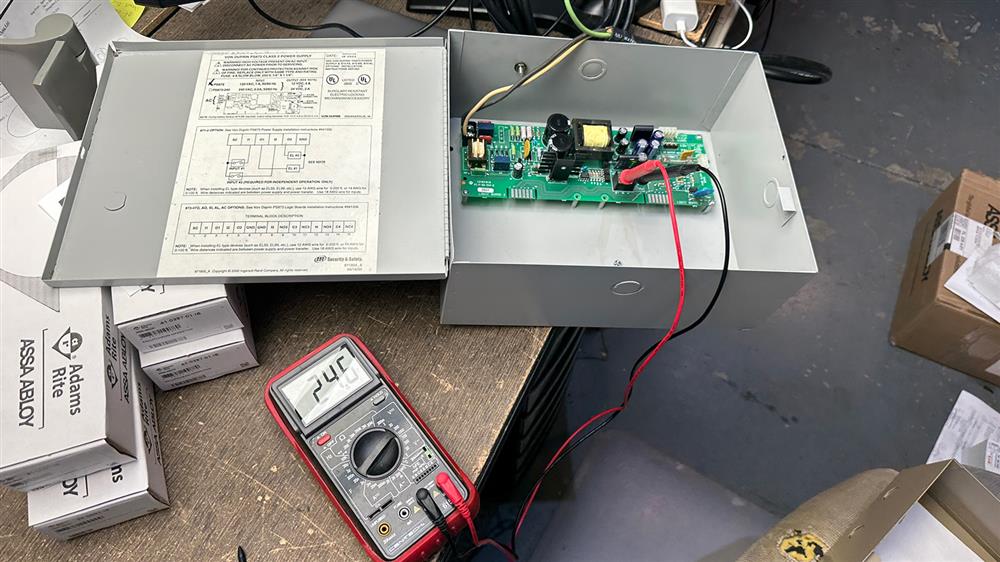 Remove the load from the output of the power supply and see if the humming stops. If it does, You may have grounding or over load issue.Verify PS873 is putting out 24VDC plus or minus 10%. The buzzing could be caused by the main board putting out excessive voltage. If this is the case you will need to replace the PS873 main board and if not available move to the PS914-XX supply and new option cards.The potted module at the electrified exit device may be faulty. Check voltage out of potted module on green and yellow. Should measure 0, if holding voltage on yellow indicates pull coil is remaining energized and pulling power supply down, replace the potted module.If using a battery backup board, overcharged batteries may cause the power supply to chatter. Disconnect the batteries and see if the chattering will stop. If it will, remove AC voltage and connect the batteries and let batteries to operate the hardware for awhile. Q: my ps-873 power supply doesnt have 24 volts. fuse is good.