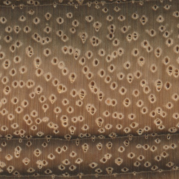 Endgrain: Diffuse-porous; solitary and radial multiples; very large pores in no specific arrangement, very few; heartwood mineral/gum deposits occasionally present; parenchyma lozenge, confluent, and marginal; narrow rays, spacing close.