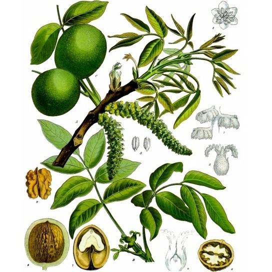 Comments: Known in Europe simply as “Walnut,” or “Common Walnut,” English Walnut (Juglans regia) is the source of what are the most common form of edible walnuts for human consumption. Branches of English Walnut are sometimes grafted onto the trunk of Claro Walnuttrees in Californian walnut orchards to take advantage of the latter tree’s roots, which are better suited to the locale and produce more fruit.