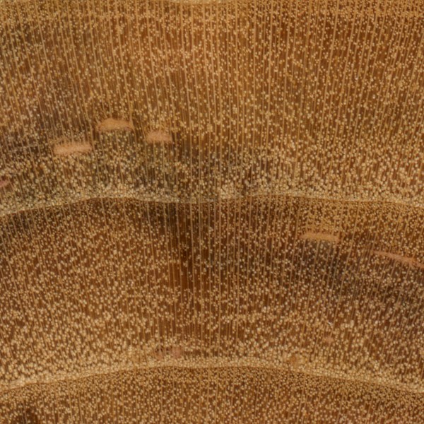 Endgrain: Semi-ring-porous to diffuse-porous; small pores, sometimes arranged diagonally, numerous to very numerous; solitary and radial multiples of 2-3; mineral/gum deposits occasionally present, though not easily seen with lens; growth rings usually distinct due to a concentration of earlywood pores; parenchyma marginal; medium to wide rays, spacing normal.