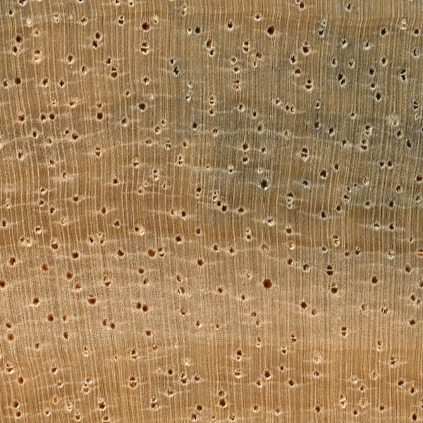 Endgrain: Diffuse-porous; medium to very large pores in no specific arrangement, few; solitary and radial multiples of 2-3; heartwood mineral/gum deposits (amber-colored) occasionally present; narrow rays may be faintly visible without lens, fairly close spacing; parenchyma winged.