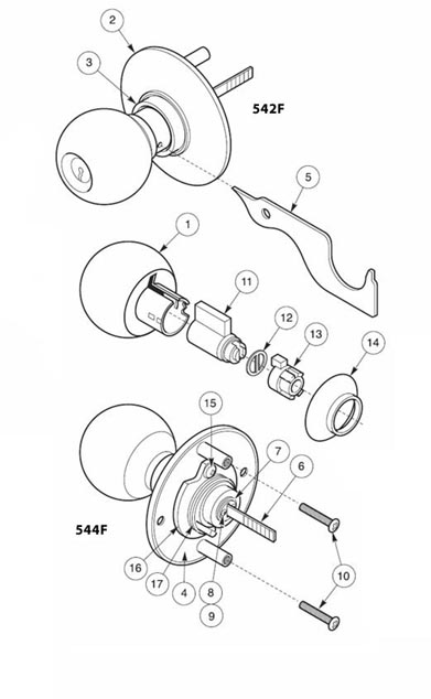 • 540F rose trim for stock doors (161 Prep). Type 161 stock door trim, if used with 7100(F), 7150(F), or 7110(F) exit devices. • Through-bolted. 1-3/4" (44mm) door standard. For doors thru 2-1/4" (57mm) or shim mounted devices, specify on order. • AU, PB, MO and CA trim designs. • Accepts cylindrical type cylinders. • 1-year warranty.